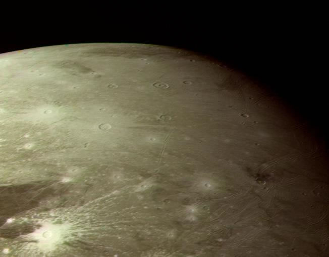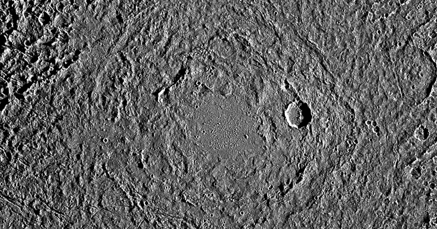 Extensive cratering is seen on both types of terrain. Unlike the Moon, however, the craters are quite flat. This is probably due to the relatively weak nature of Ganymede's icy crust which can flow over geologic time and soften the relief. Ancient craters whose relief has disappeared leaving only a "ghost" of a crater are known as "palimpsests."