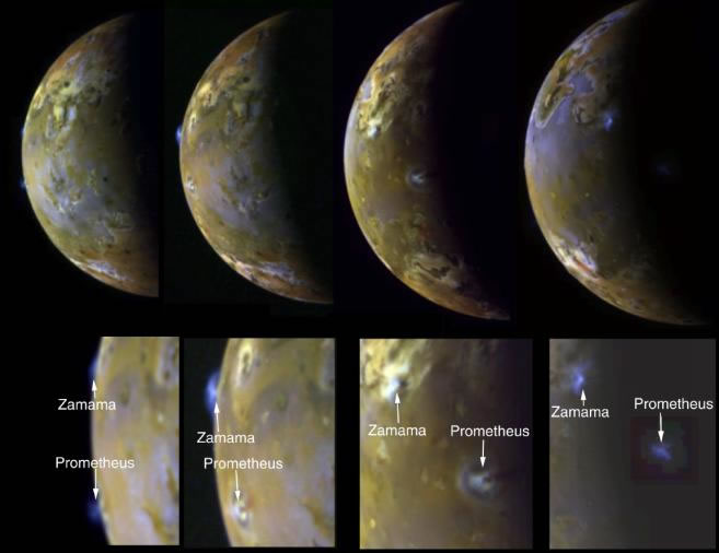Some of the volcanoes are active! Striking photos of actual eruptions with plumes 300 km high were sent back by both Voyagers and by Galileo. This may have been the most important single discovery of the Voyager missions. It was the first real proof that the interiors of other "terrestrial" bodies are actually hot and active. The material erupting from Io's vents appears to be some form of sulfur or sulfur dioxide. The volcanic eruptions change rapidly. In just four months between the arrivals of Voyager 1 and Voyager 2 some of them stopped and others started up. The deposits surrounding the vents also changed visibly.